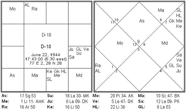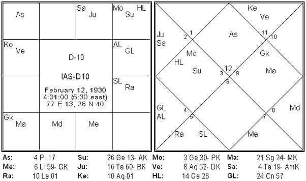 In D-10, Sagittarius is again rising, it is 2nd house of D-1 and friendly. Jupiter is well placed in D-1 and D-9. Lagna lord is in 9th house with Sun and Saturn and Venus, lord of 9th, 3rd and 6th. 10th lord is in 11th house and aspected by Saturn, the 3rd lord. Jupiter is also aspecting the lagna.